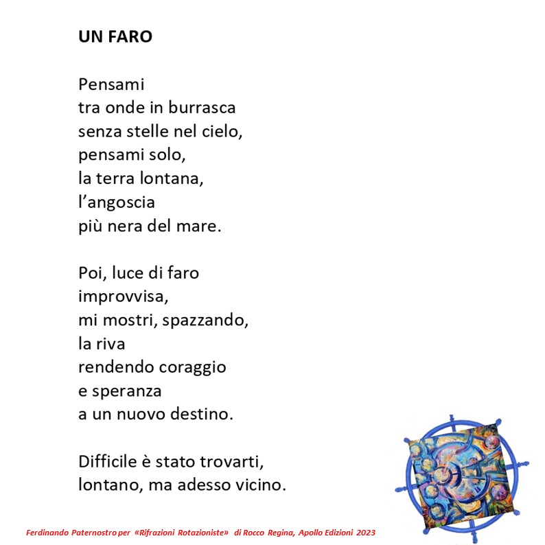 “Rifrazioni Rotazioniste si presenta come un’opera elegante e di piacevole lettura. Opera affollata e ricca: oltre all’autore dei quadri troviamo ben dieci artisti tra poetesse e poeti: Anilha Dahriu, Stanislao Donadio, Grazia Dottore, Rosanna Filomena, Gerardo Melchionda, Pasquale Montalto, Antonella Multari, Ferdinando Paternostro, Michele Pochiero ed Antonia Tursi. Ad arricchire l’opera pubblicata da Apollo Edizioni di Bisignano, la prefazione di Aurelio Pace e la postfazione di Giovanni Pistoia. In appendice, come sigillo sull’opera il Manifesto del Rotazionismo.” (Francesco Aronne, Faronotizie – N° 203 – Marzo 2023).