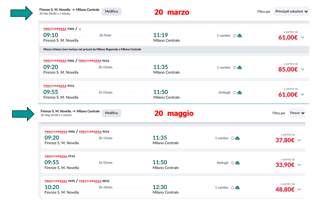 Paghi più o meno sempre la stessa tariffa per quella tratta, indipendentemente dal momento in cui acquisti il biglietto.