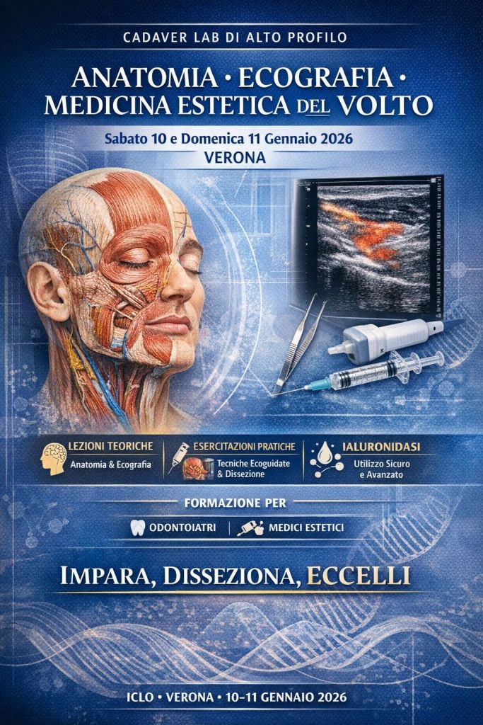 Anatomia • Ecografia • Tecniche di medicina estetica del volto ecoguidate • Dissezione anatomica applicata • Metodica d’uso della ialuronidasi